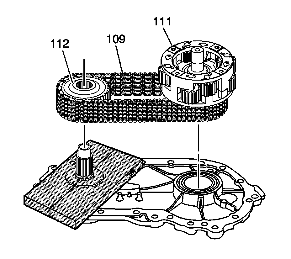 15. Remove the lower sprocket (112), chain (109), and carrier (111) as an assembly.