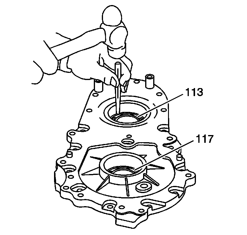 21. Using a hammer and a suitable punch, remove the front output bearing (113) and input bearing (117) if they are to be replaced.