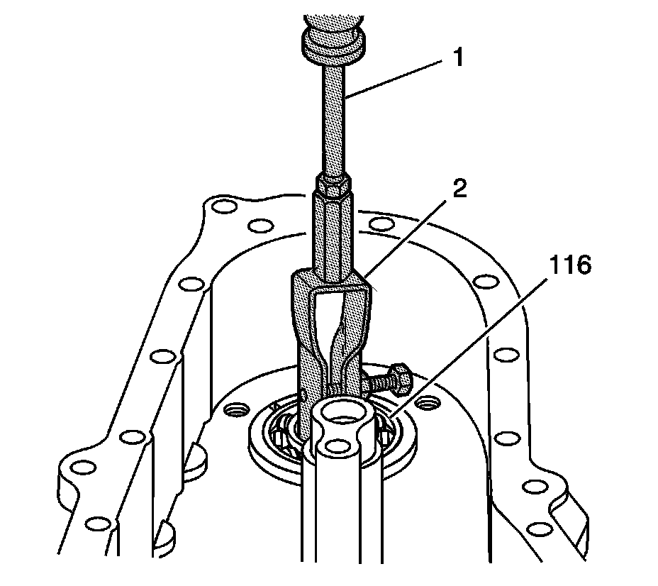 32. Using the J-2619-A - slide hammer (1) and the J 29369-1 - bushing and bearing remover (2), remove the front output cover bearing (116) from the cover.
