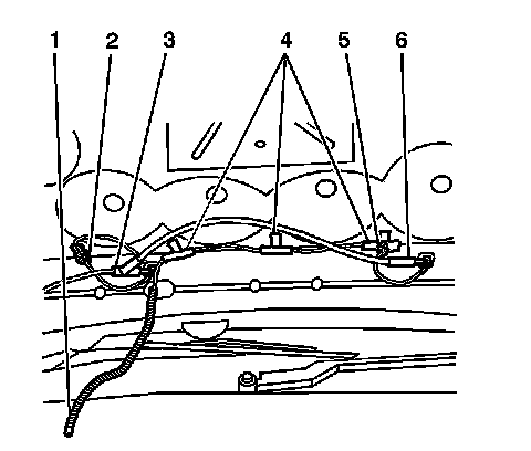 7. Disconnect the washer hose connections (3, 6) from the washer nozzles.