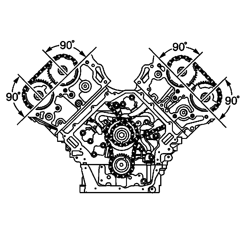 The crankshaft and camshafts are correctly timed when the crank sprocket and the intermediate shaft sprocket have their timing marks aligned and all 4 camshaft position actuator timing marks are perpendicular (90 degrees) to the cylinder head deck surface at the top of their rotation. The black timing chain links are used for assembly purposes. Do not reference these black links to determine if the engine timing components are properly aligned. The black links will only align with the actuator timing marks and the intermediate shaft sprocket, once every 126 revolutions. For this reason, it is not necessary to have the black secondary chain links aligned with the timing marks when servicing only one of the secondary timing components. Proper alignment is maintained by marking a chain link and sprocket gear tooth with a paint stick prior to disassembling individual components. When servicing individual components, refer to the appropriate procedure.