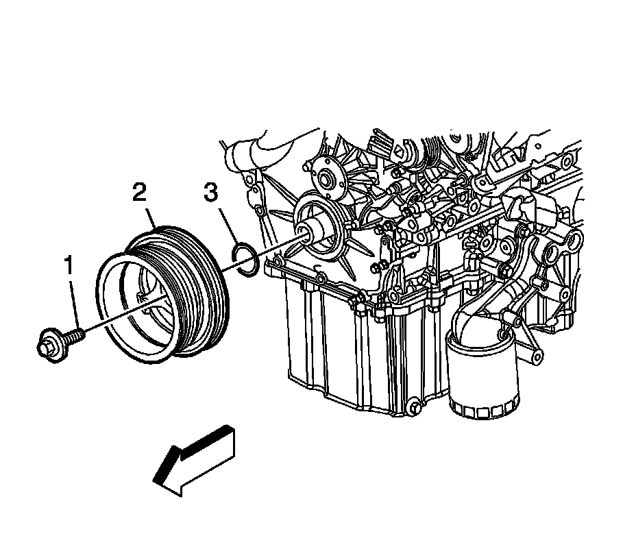 10. Install the water pump pulley. Refer to Water Pump Replacement (LF1/LLT) (Service and Repair)Water Pump Replacement (LC3) (Service and Repair)Water Pump Replacement (LH2) (Service and Repair).