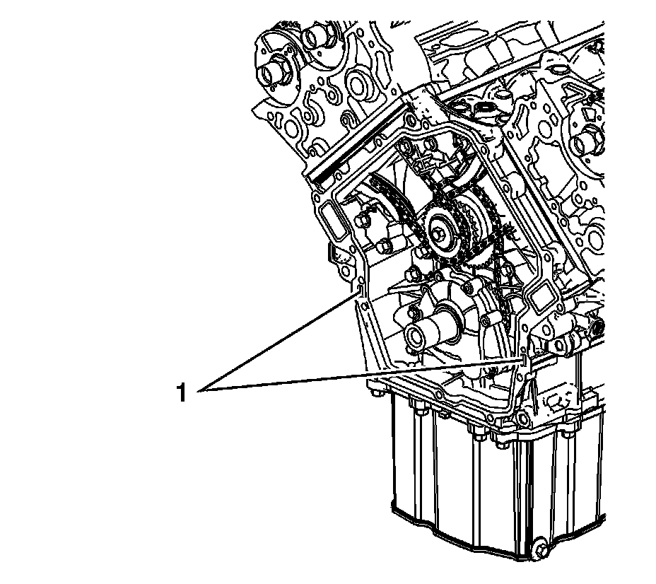 5. Place a small amount of sealant at the engine front cover gasket pad area located on top of the split line of the upper and lower crankcases (1). Refer to Adhesives, Fluids, Lubricants, and Sealers (Specifications) for the correct part number.