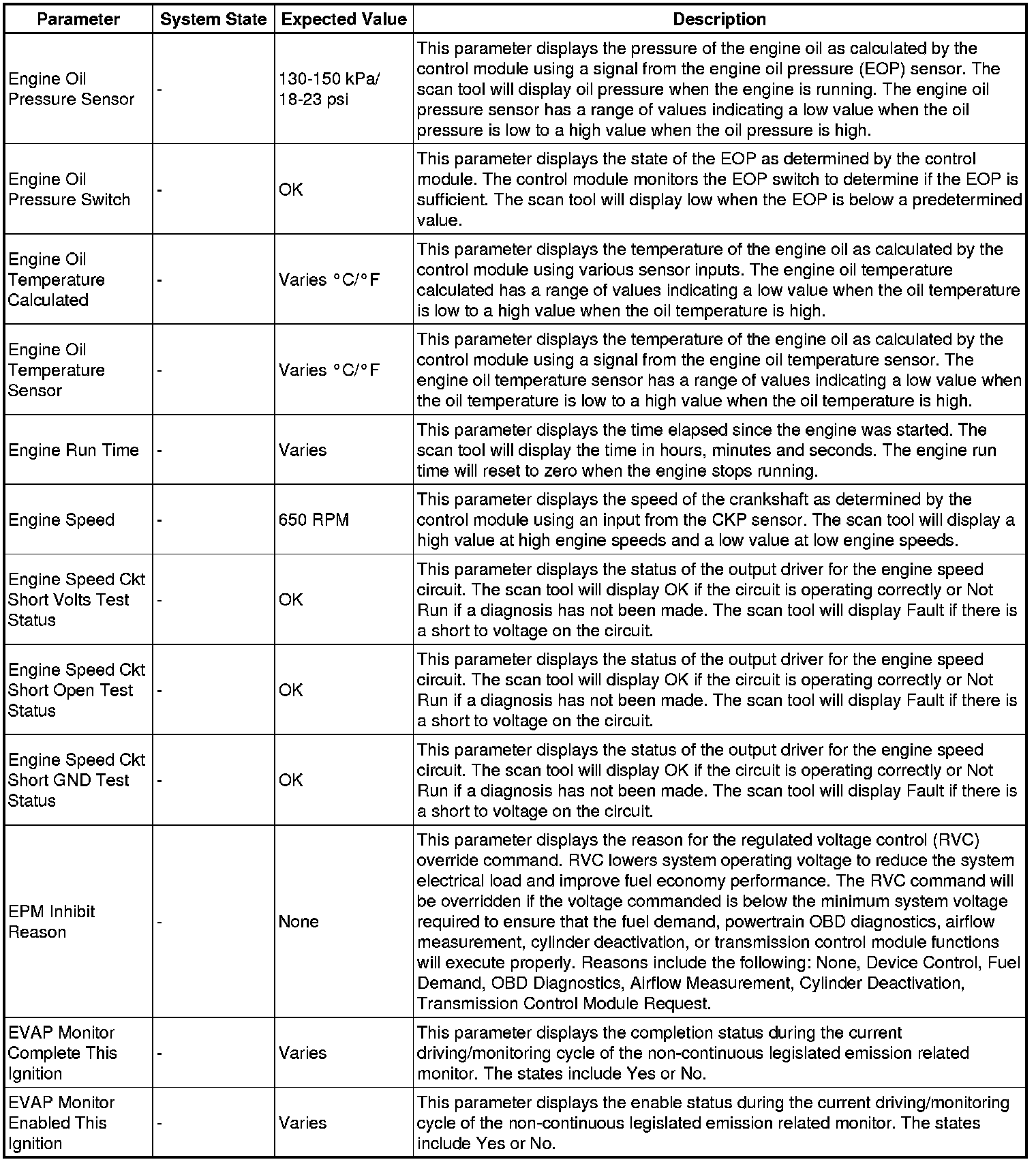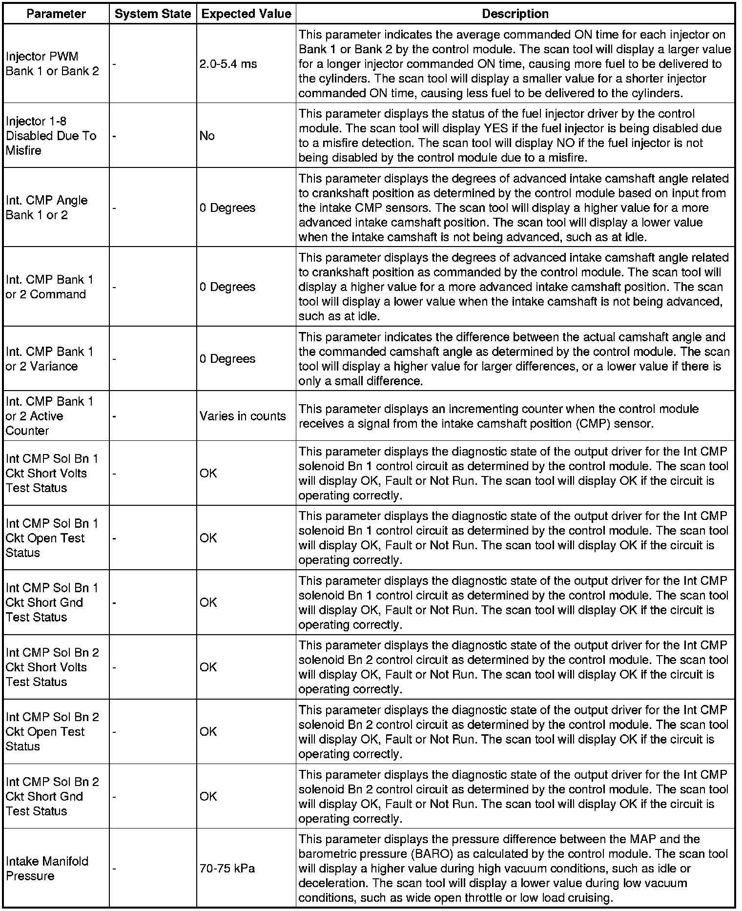 The scan tool values from a properly running engine may be used for comparison with the engine you are diagnosing. The engine scan tool data list represents values that would be seen on a normally running engine.