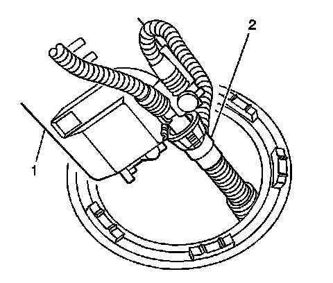 6. Carefully lift the primary fuel tank module (1) from the fuel tank only enough to access the transfer tube (2).