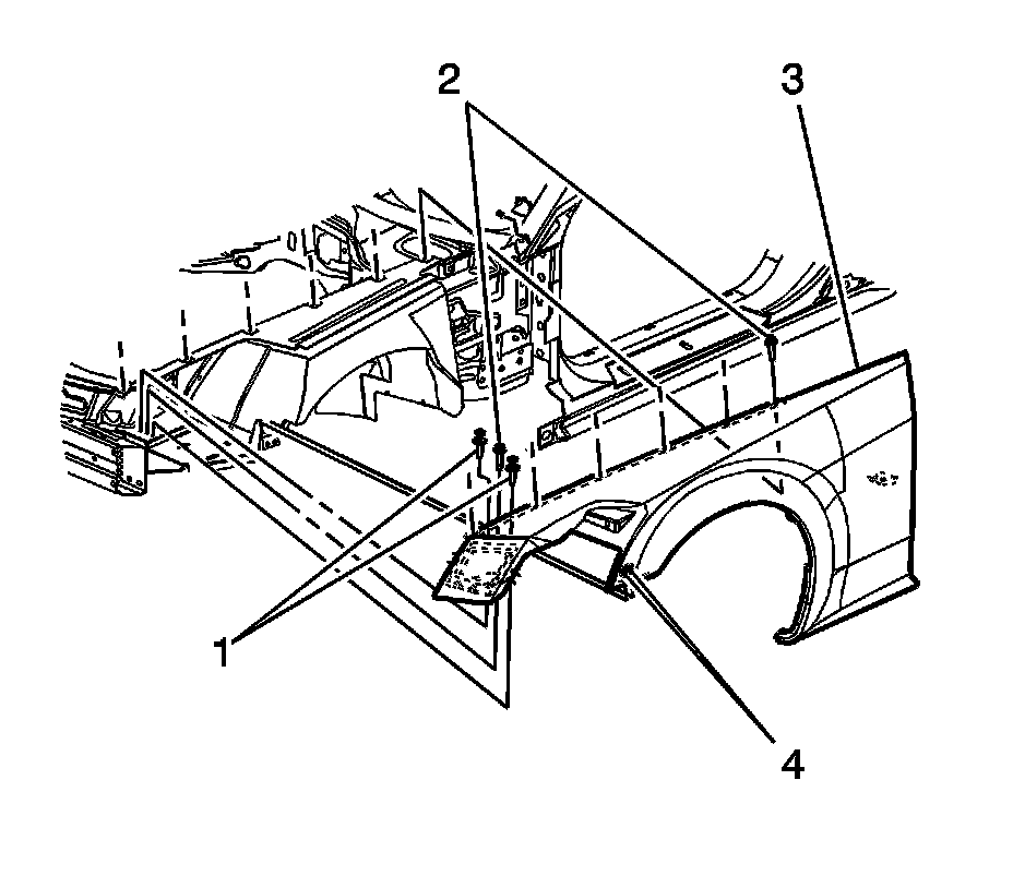 3. Install the bolts (4) securing the front portion of the fender (3) to the vehicle and tighten to 9 Nm (80 lb in).