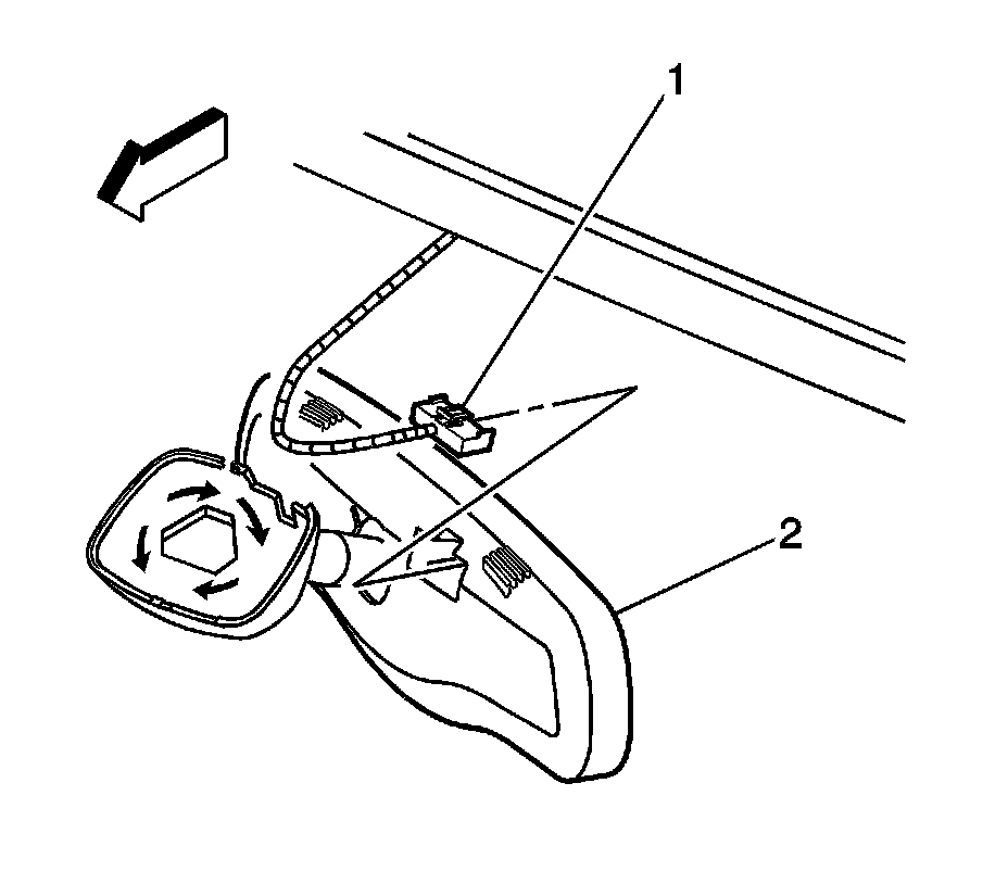 2. Remove the electrical connector (1) from the back of the inside rearview mirror (2).