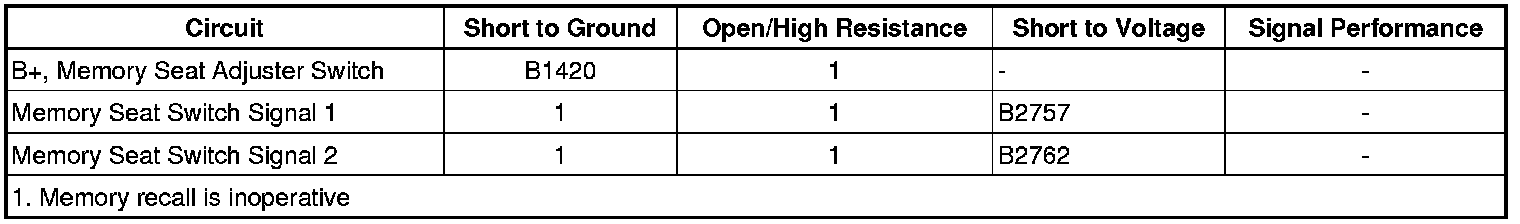 Battery voltage through the TILT/TELE SW/MEM SEAT MOD 10A located in the body control module fuse block is supplied at all times to the memory seat adjuster switch. When the memory recall switches are pressed they send a 12-volt signal to the memory seat module (MSM) indicating the memory recall request. In response to this signal, the MSM commands the driver seat motors to move to the appropriate seat positions stored in memory.
