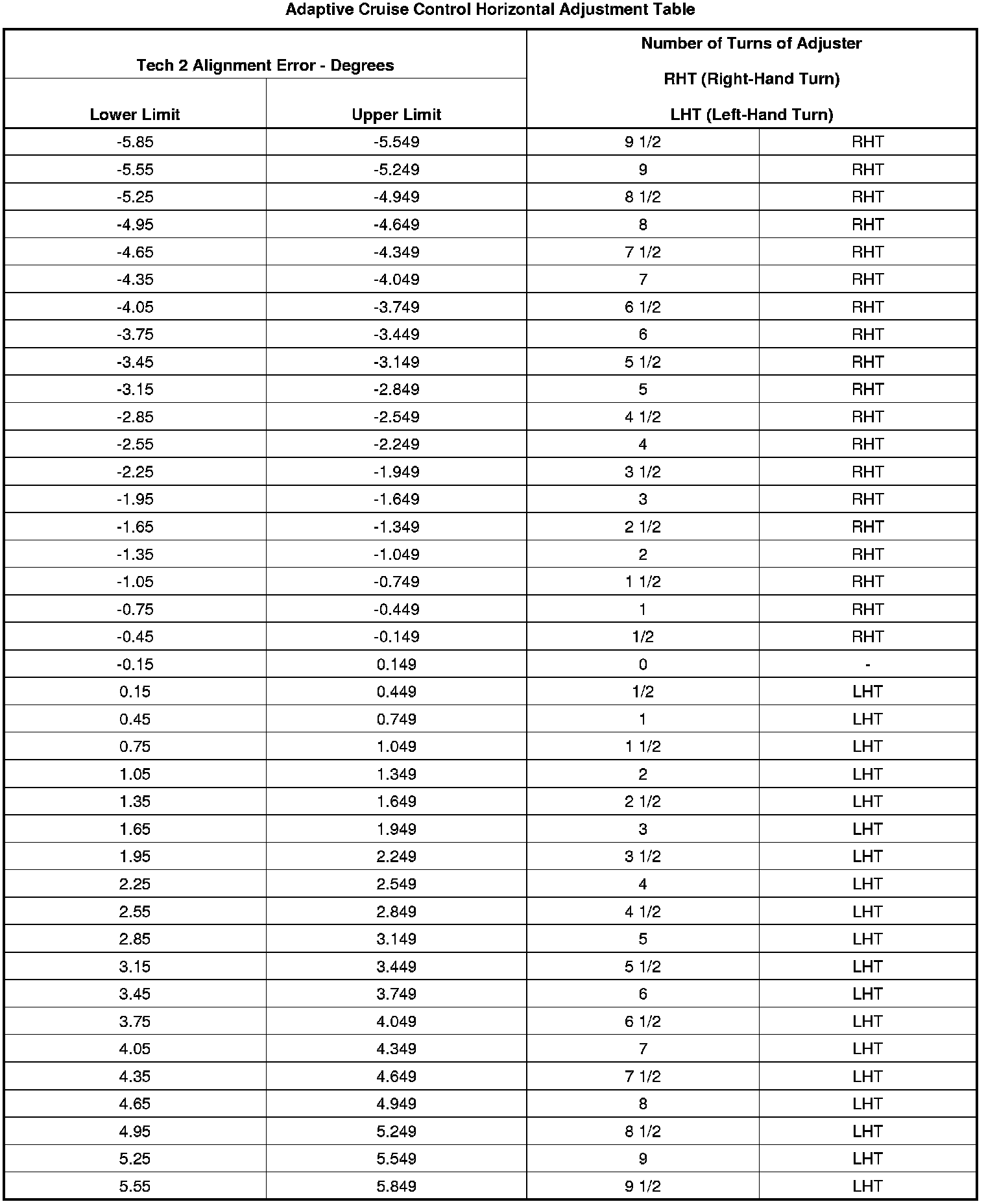4. Use a Tech 2 and the Adaptive Cruise Control Horizontal Adjustment Table. Using the Tech 2 Alignment Error, adjust the horizontal until the alignment error is between -2.5 and +2.5 degrees.