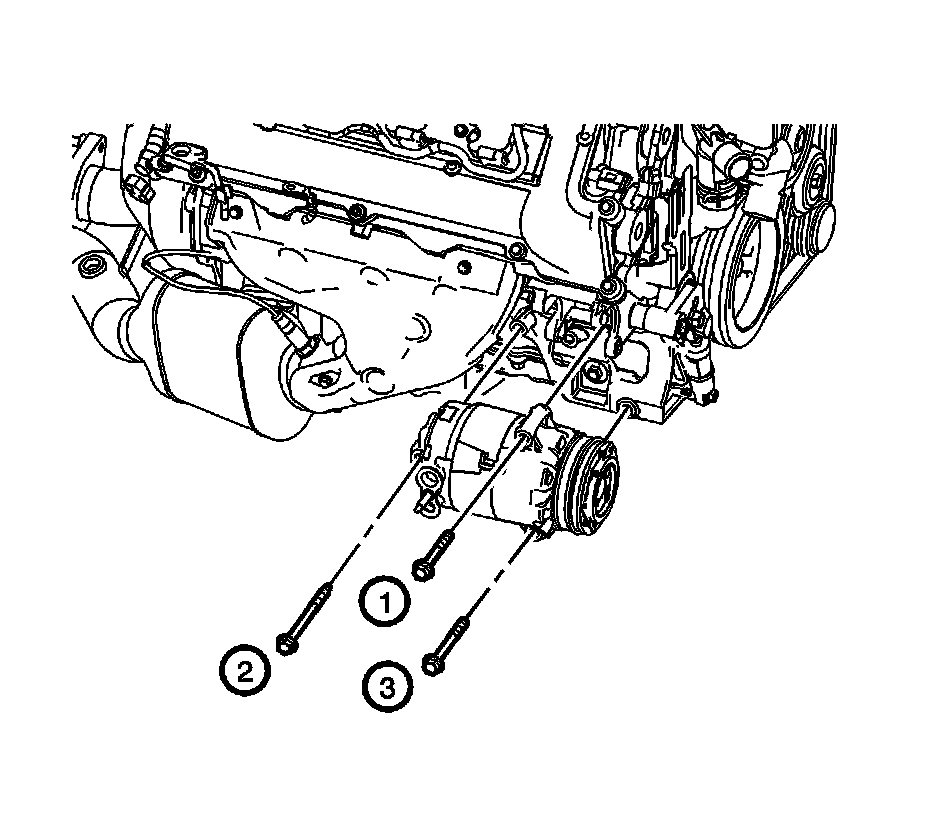19. Remove the A/C compressor mounting bolts (1, 2, 3).