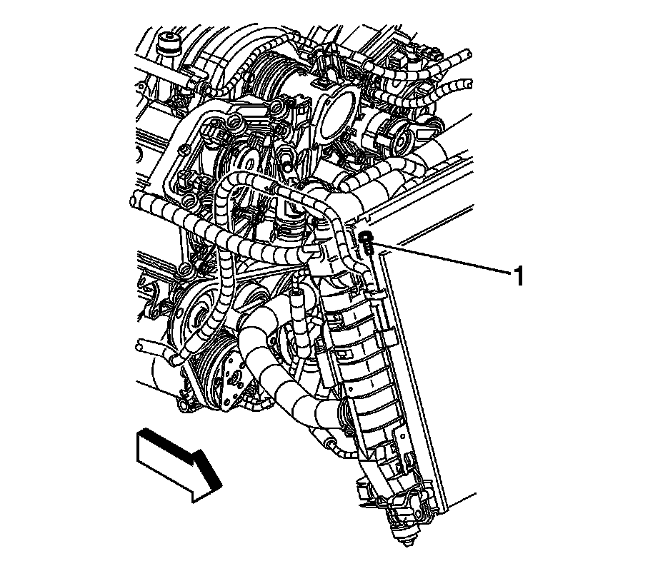 3. Remove the A/C compressor hose assembly to A/C condenser fitting bolt (1).