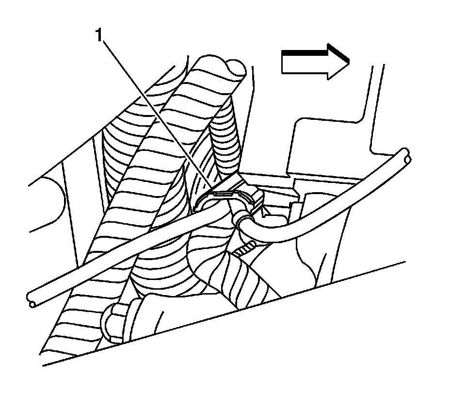 1. Release the lock tab, and disconnect the PCV foul air tube (1) from the PCV orifice fitting on the right camshaft cover. Refer to Positive Crankcase Ventilation Hose/Pipe/Tube Replacement (Service and Repair).