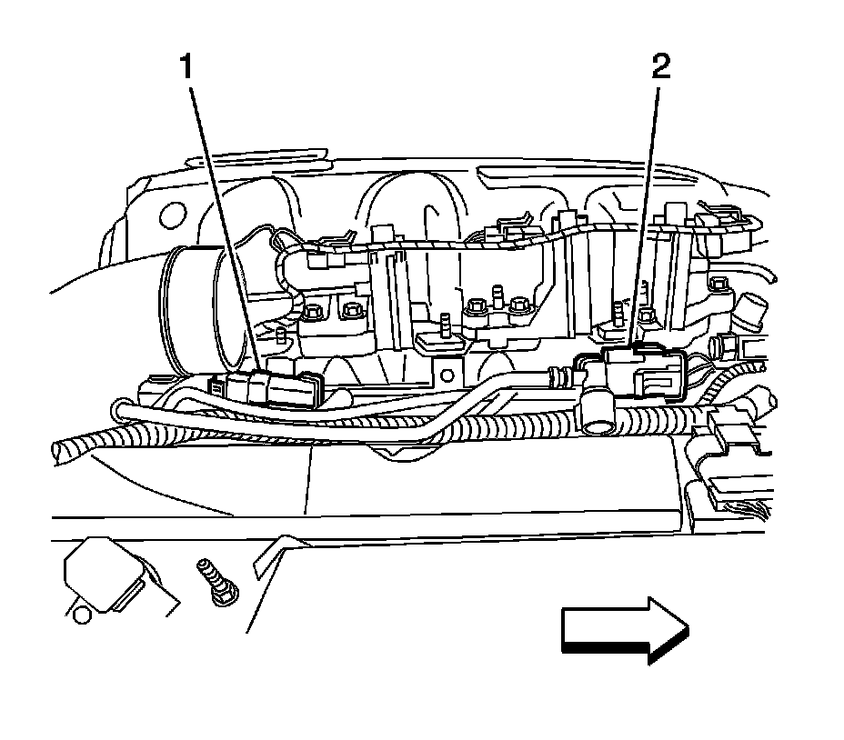 6. Install both oxygen sensor electrical connector assemblies (1, 2) to the fuel rail brackets.