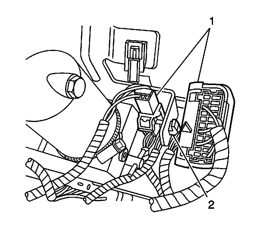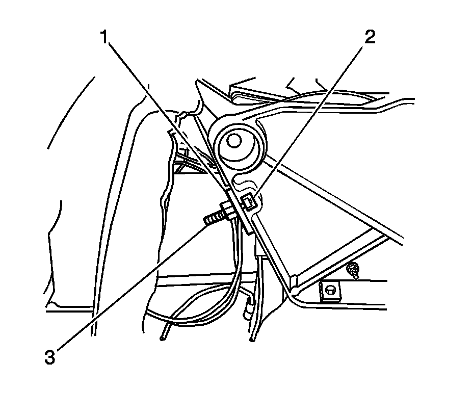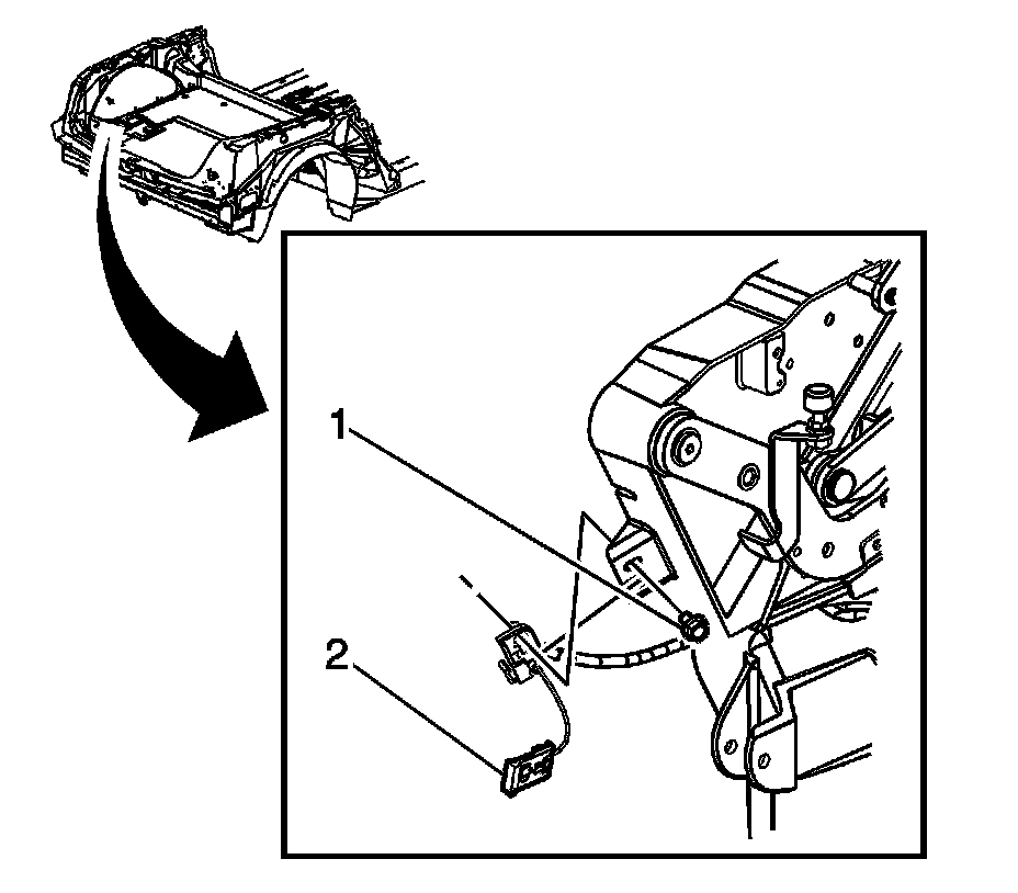 16. Install the fastener (1) to the bracket retaining the rear door release cable (2) and tighten to 3 Nm (27 lb in).