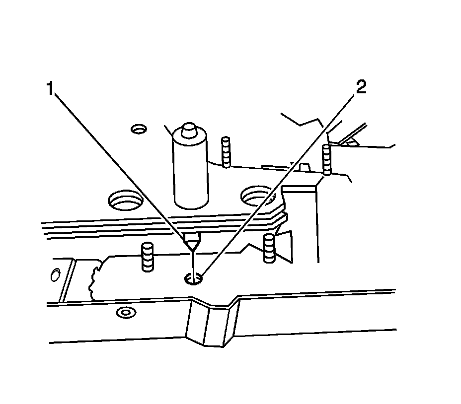 3. Position the folding top module to the vehicle and align the front locating pins (1) to the holes (2) in the B-pillars while lowering the module into place.
