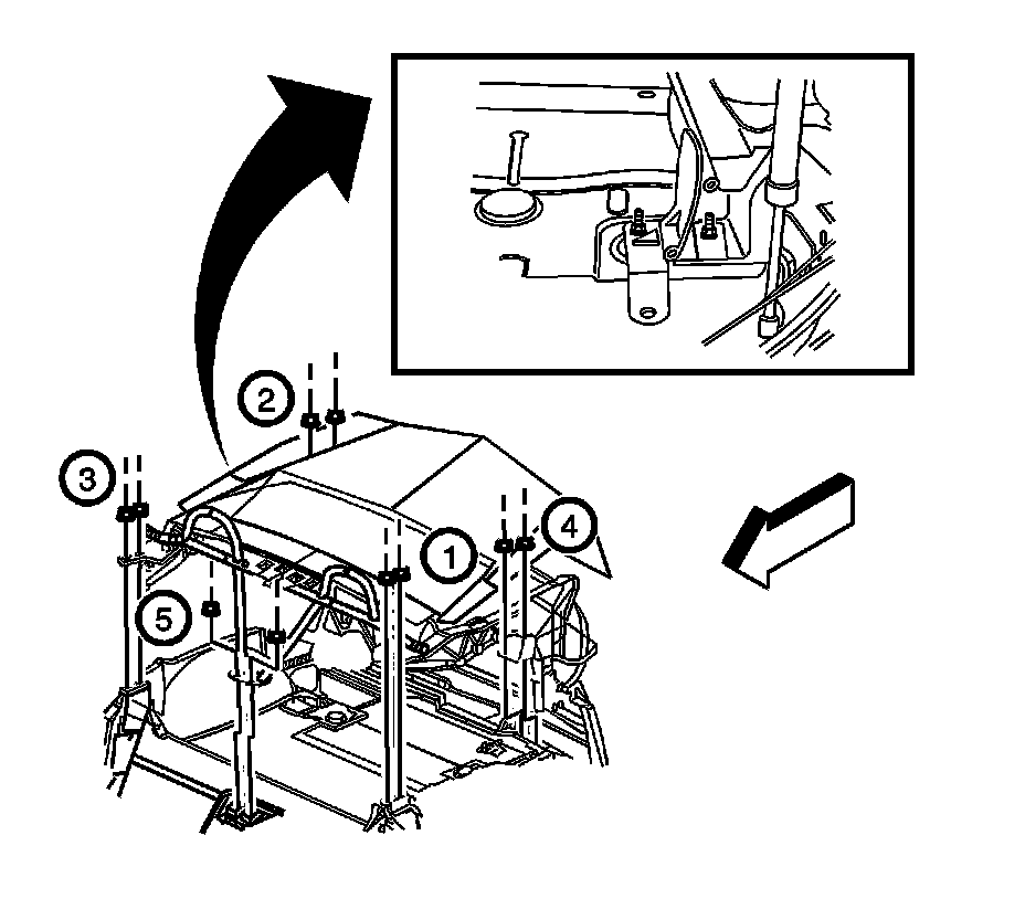 4. Install the nuts on the folding top module and hand tighten the nuts in the designated sequence. Tighten the nuts in the designated sequence to 24 Nm (18 lb ft).