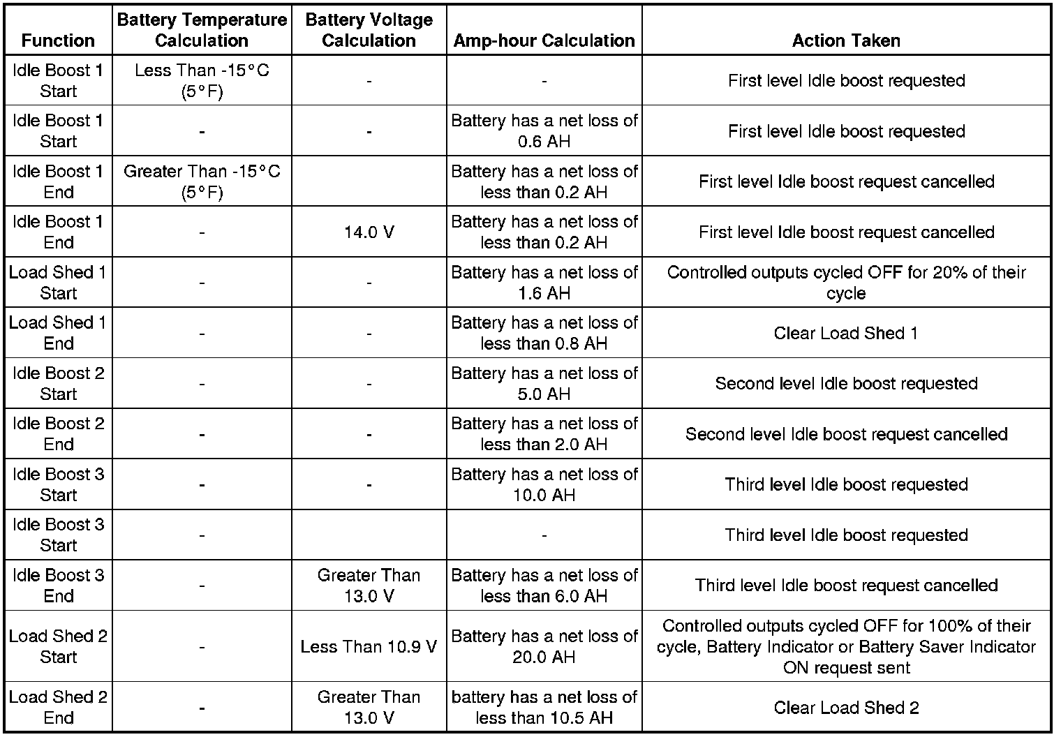 During each load management function, the BCM checks the battery temperature, battery voltage and amp-hour calculations and determines if the BCM should implement a different power management function.
