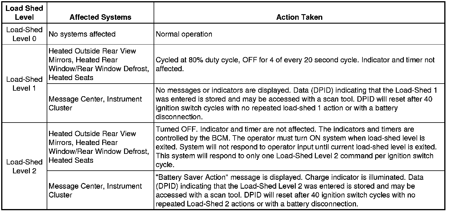 The BCM will either request an increase in the engine idle speed from the ECM or the BCM will turn off loads, called the load-shed function, in order to preserve the vehicle electrical system operation. The criteria used by the BCM to regulate this electrical load management are outlined below: