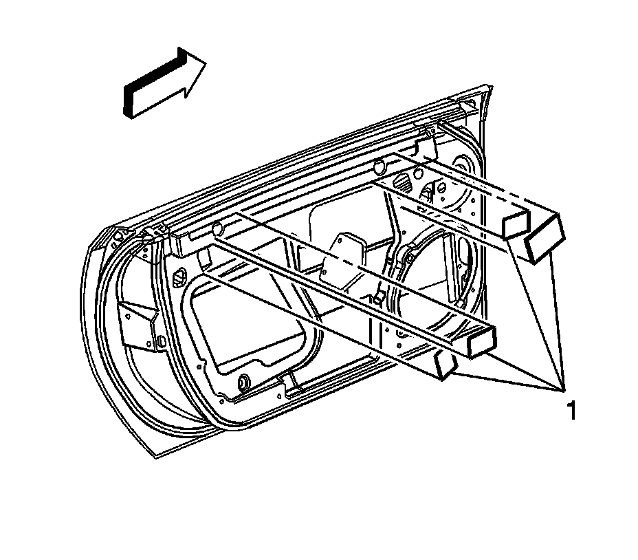 6. Remove the small mastic seals (1) near the top of the door for access to the upper regulator mounting fasteners.