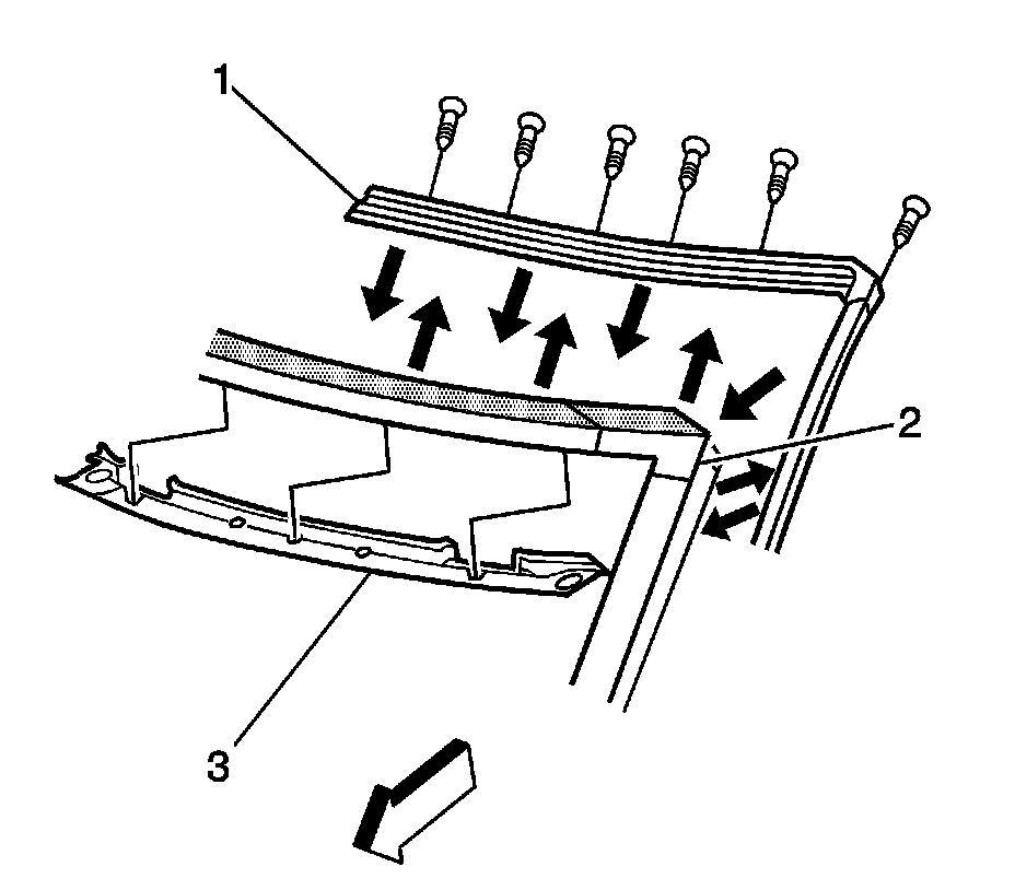 3. Install the windshield upper garnish molding (3). Refer to Windshield Garnish Molding Replacement (Service and Repair).
