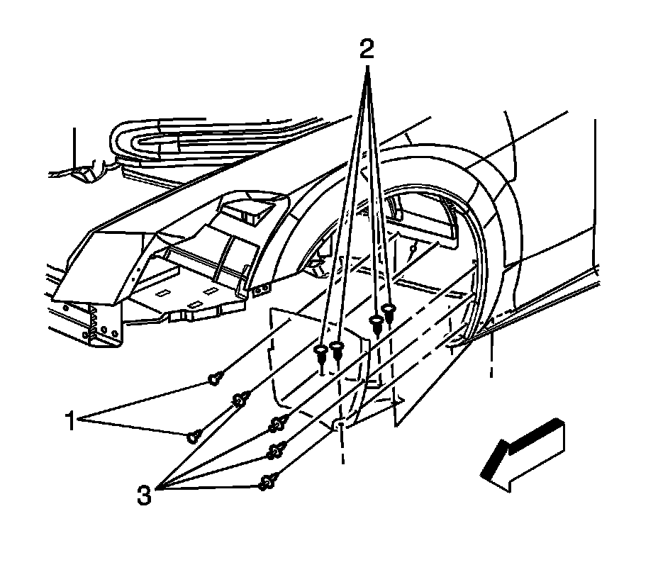 5. Align the lower fender to the body, and install the lower wheelhouse splash shield and fasteners (1, 2, 3).