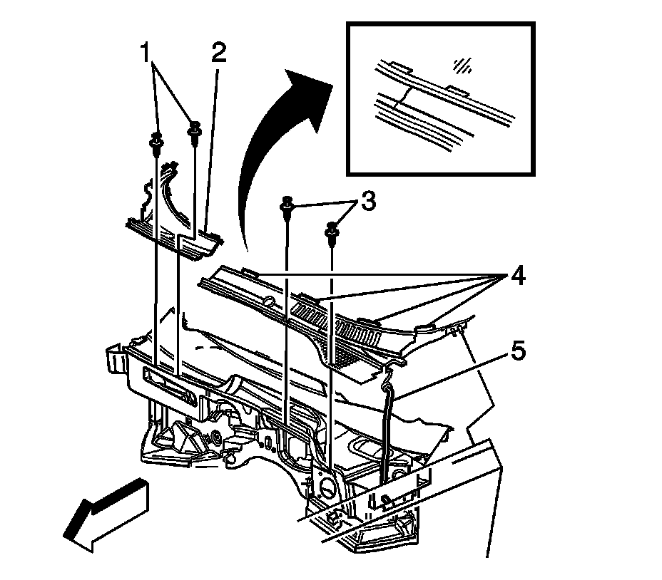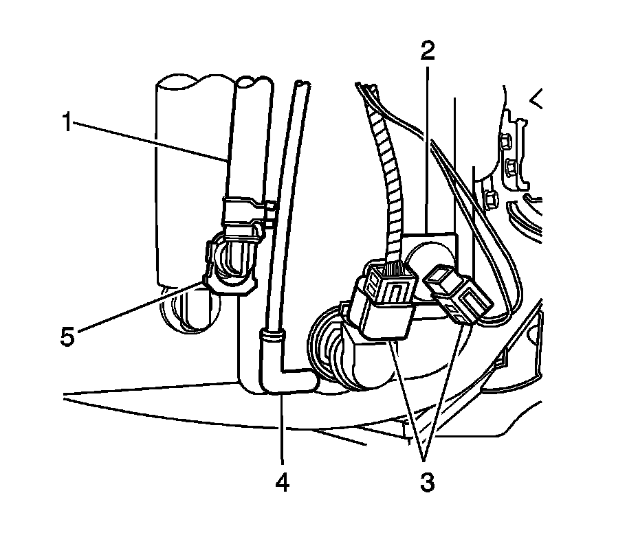 2. Disconnect the washer pump hose (5) from the driver side air inlet grille.