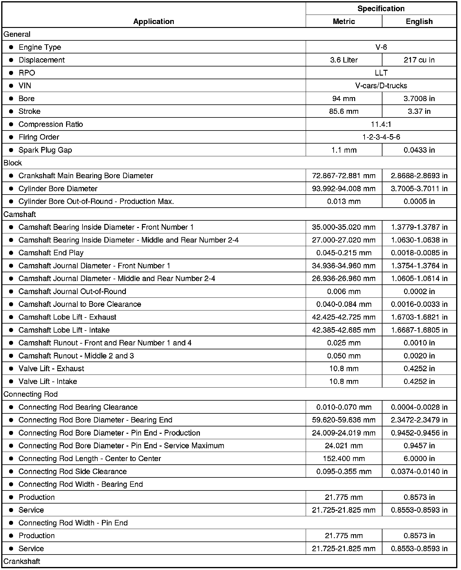 Engine Mechanical Specifications (LLT)