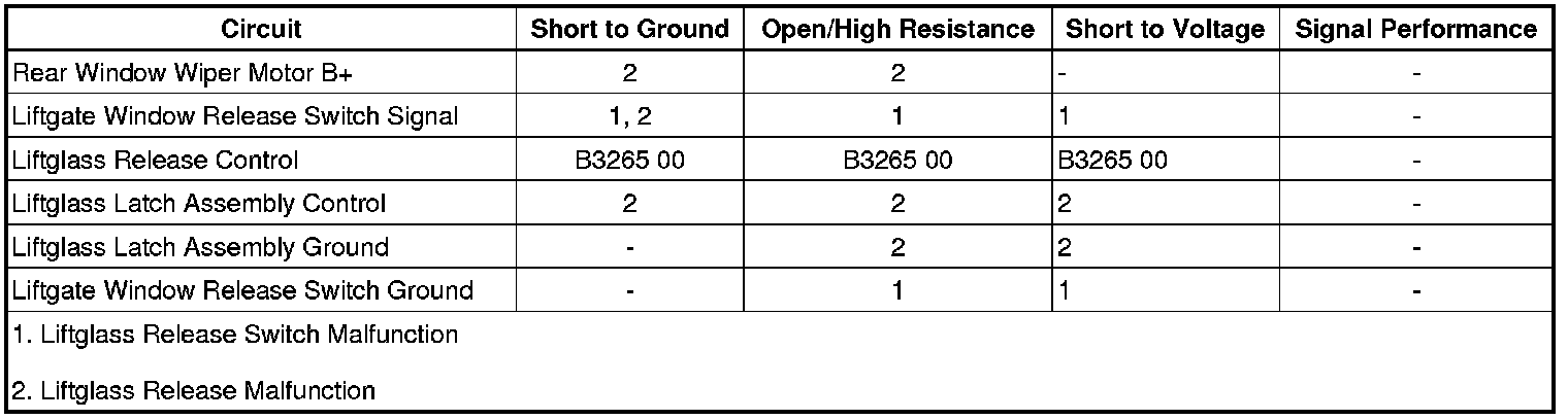 The liftglass release switch is an input to the body control module (BCM). The BCM supplies battery voltage to the signal circuit and when the release switch is activated the signal circuit voltage goes low. The BCM controls the liftglass release actuator through the rear wiper motor control module. When the release switch signal is activated, the BCM applies battery voltage as a signal through the liftglass latch release control circuit to the rear wiper motor control module. The rear wiper motor control module supplies voltage to the release actuator through the liftglass latch assembly.