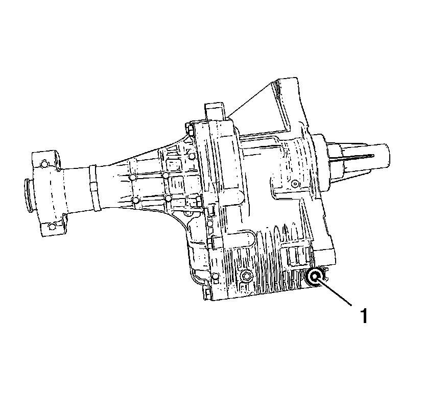 The transfer case oil drain plug (1) is located at the front of the assembly.