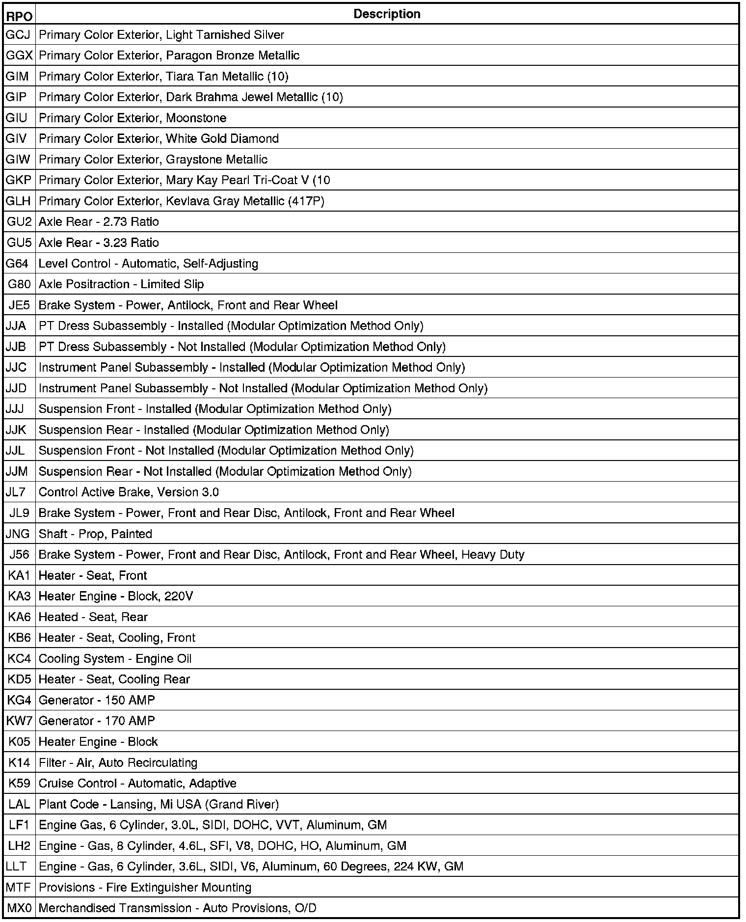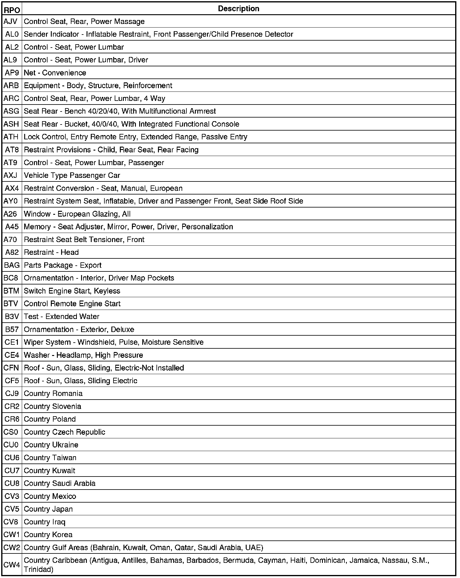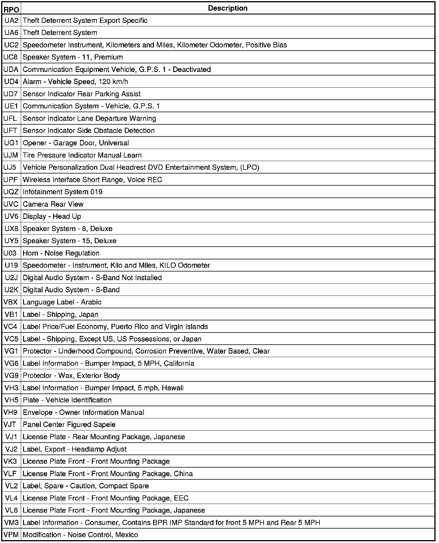 The following table provides the description of the Regular Production Option (RPO) codes that are available on the vehicle. The vehicle's RPO list is printed on the Service Parts Identification Label.