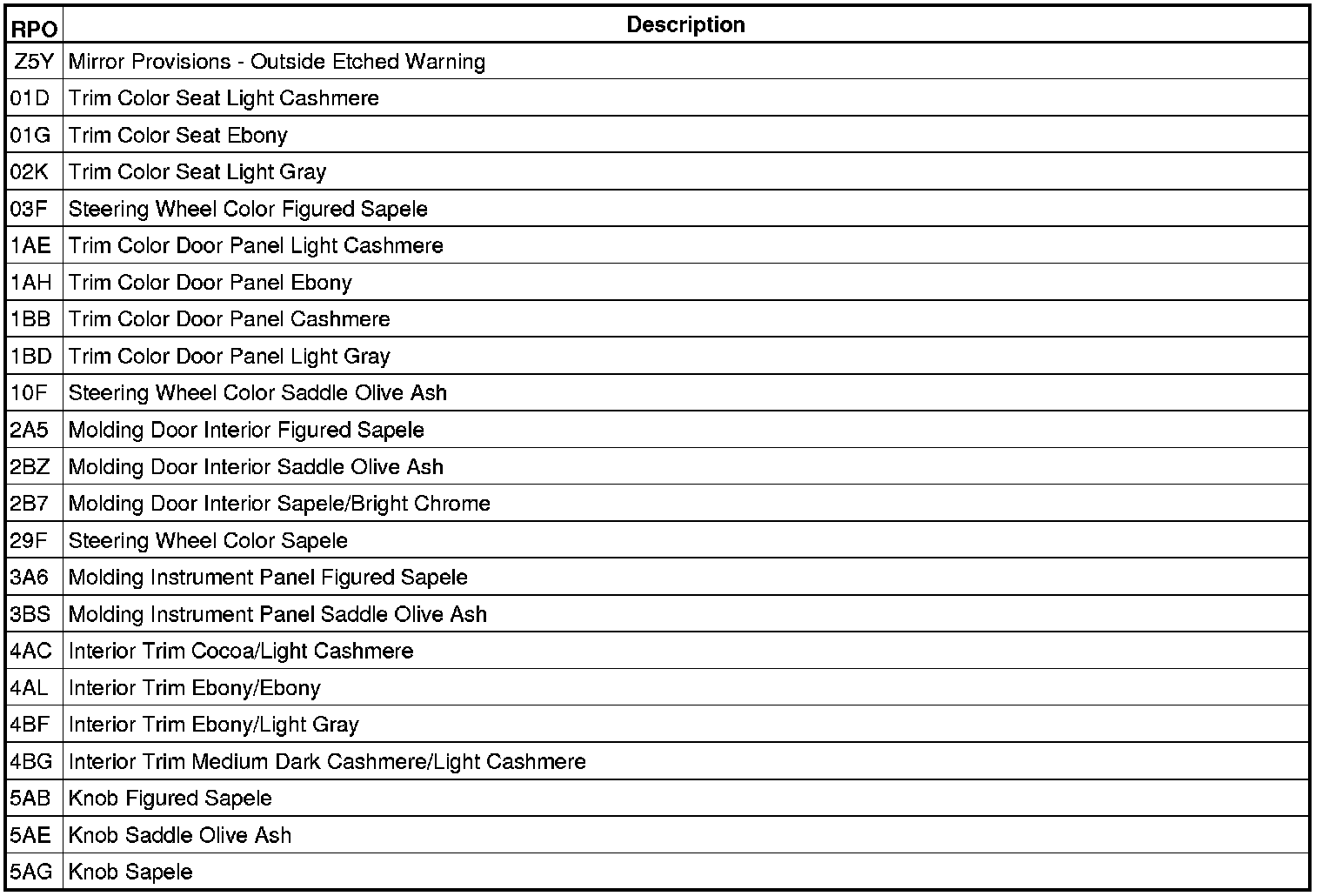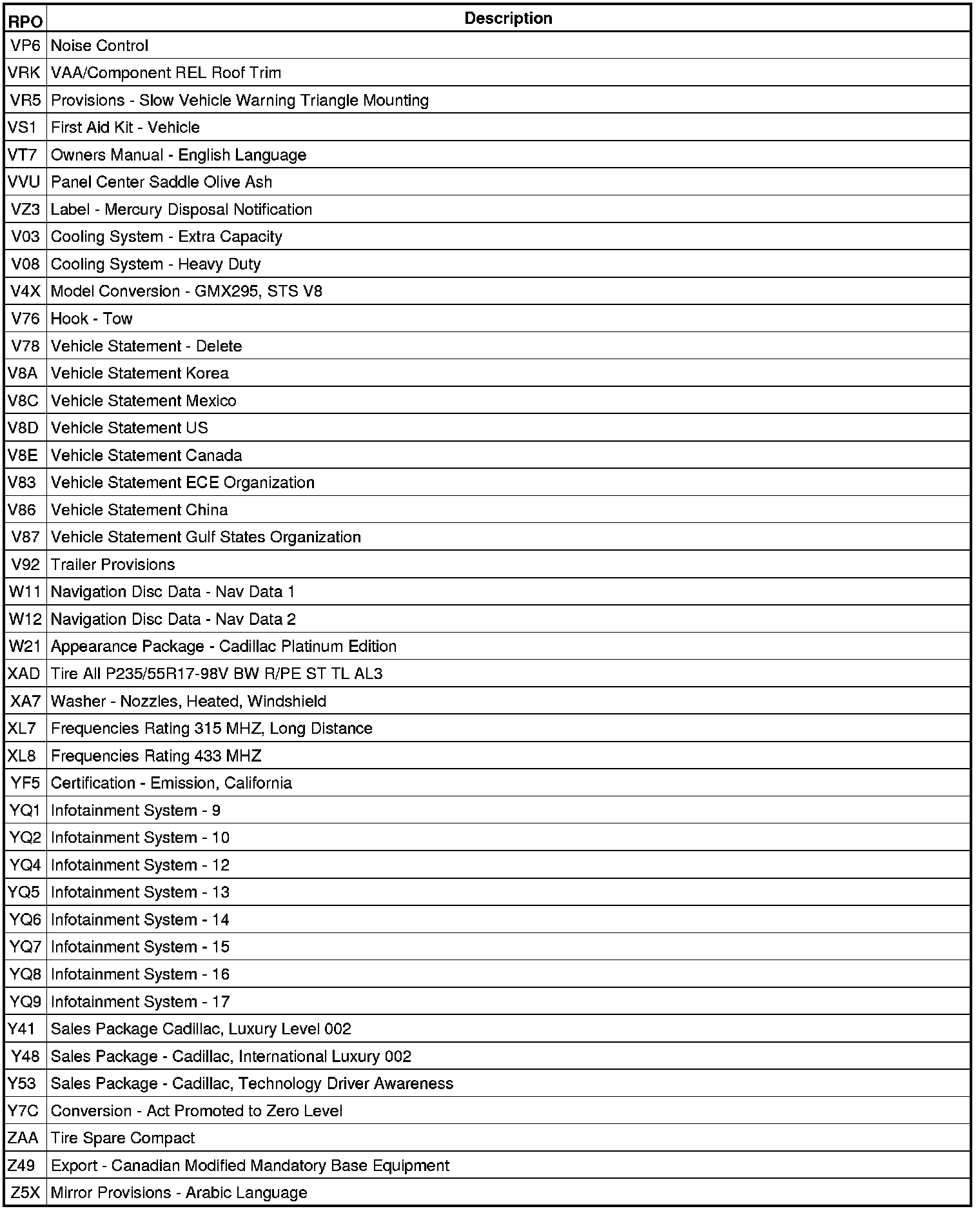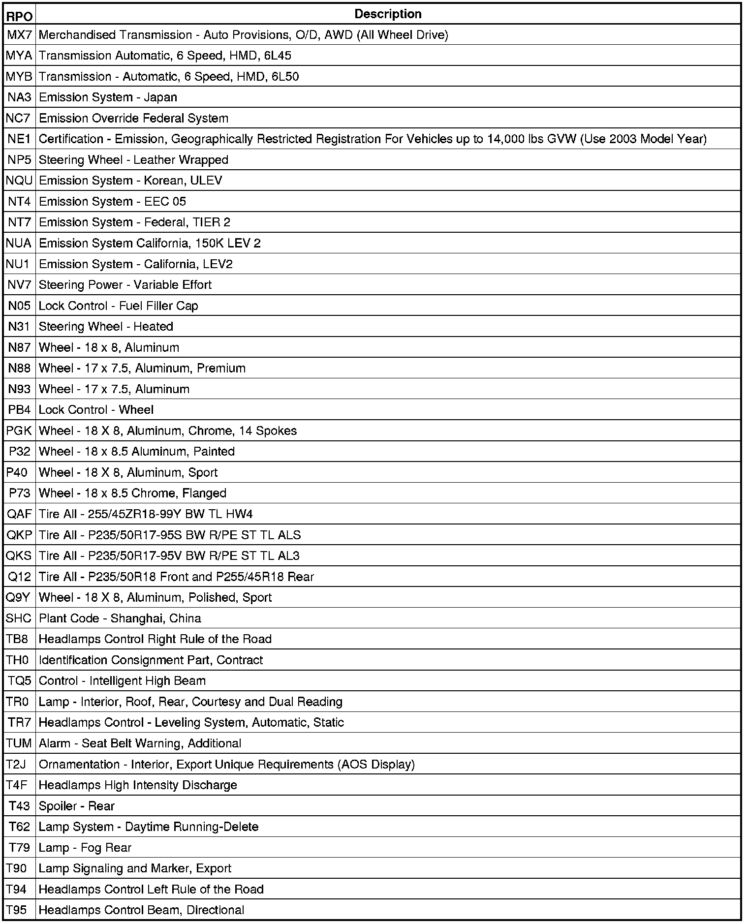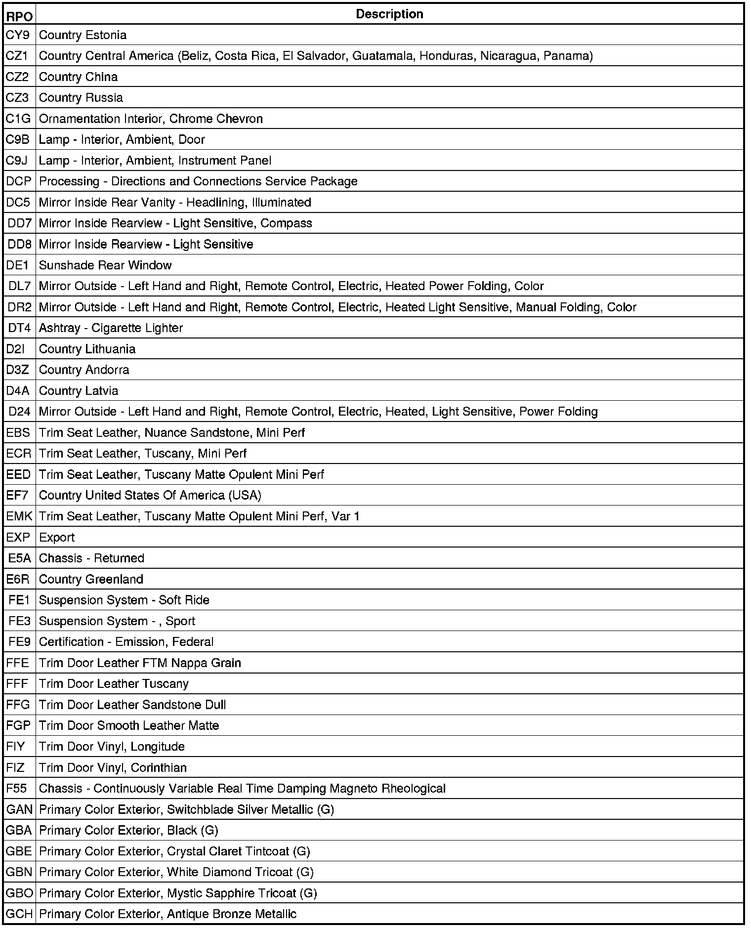 The following table provides the description of the Regular Production Option (RPO) codes that are available on the vehicle. The vehicle's RPO list is printed on the Service Parts Identification Label.