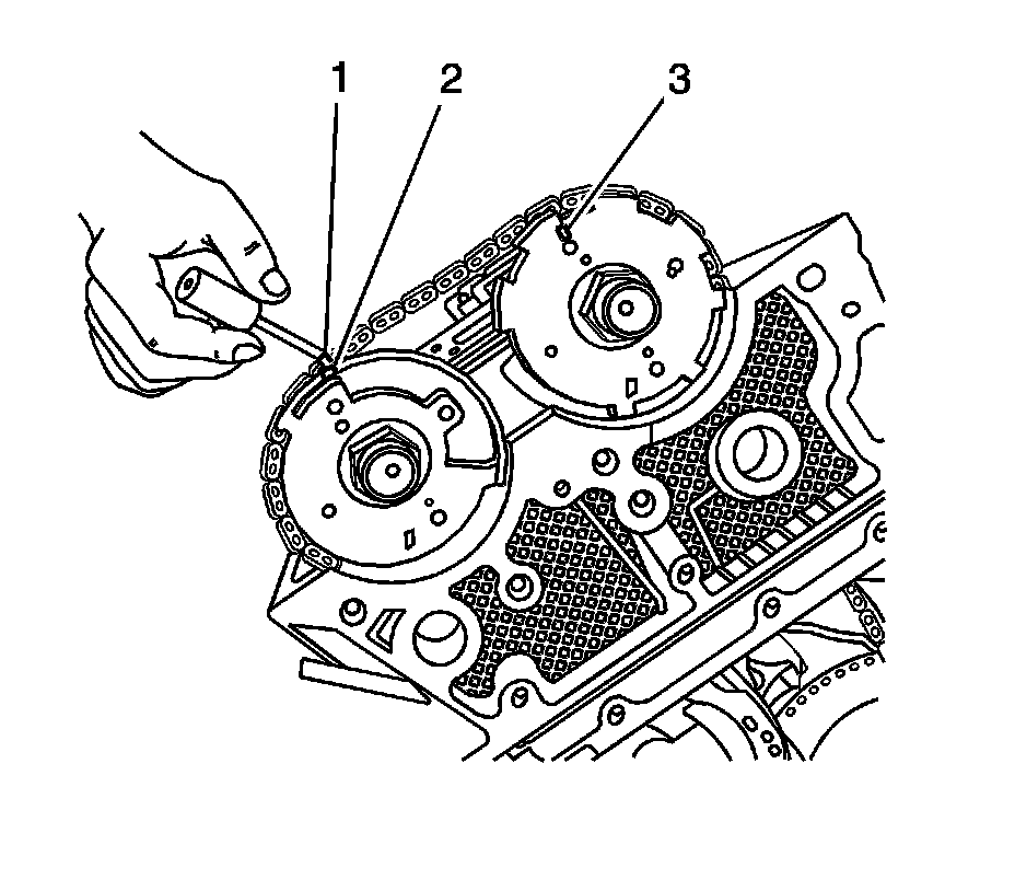 5. Use a paint stick to create a mark (1) on the timing chain link adjacent to each camshaft position actuator timing mark (2, 3).