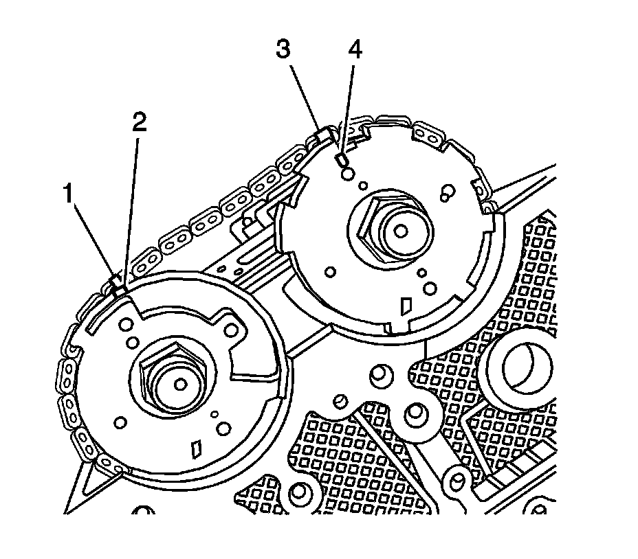 7. Ensure that the previously created paint marks (1, 3) still line up with the sprocket timing marks (2, 4).