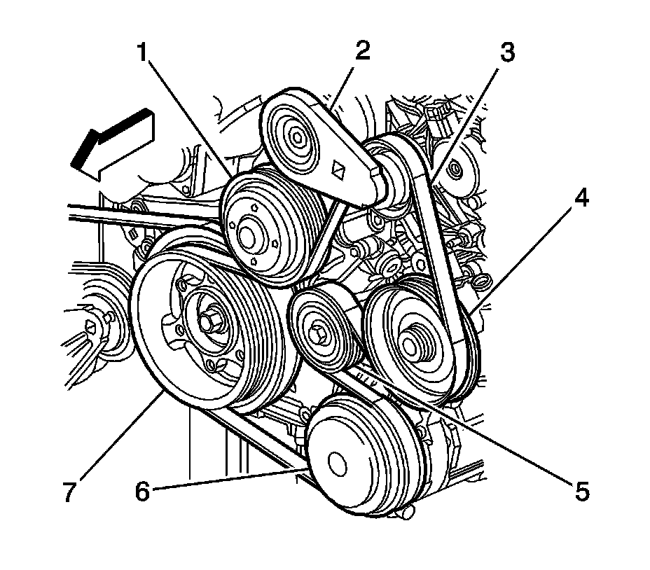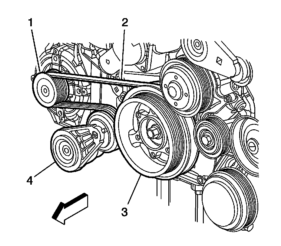 1. Remove the air conditioning, power steering, and water pump belt (3). Refer to Water Pump and Air Conditioning Compressor and Power Steering Pump Belt Replacement (Water Pump and Air Conditioning Compressor and Power Steering Pump Belt Replacement).