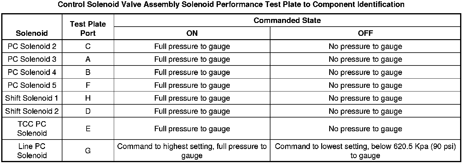 A pressure gauge is used to measure the pressurized air through the solenoid control ports. When a solenoid is commanded ON with the scan tool, pressurized air flows through the solenoid control port and displays on the pressure gauge. When the solenoid is commanded OFF with the scan tool, there is no pressurized air flow through the solenoid control port to the pressure gauge. The recommended shop air pressure for this test is 620.5-690.4 Kpa (90-100 psi).