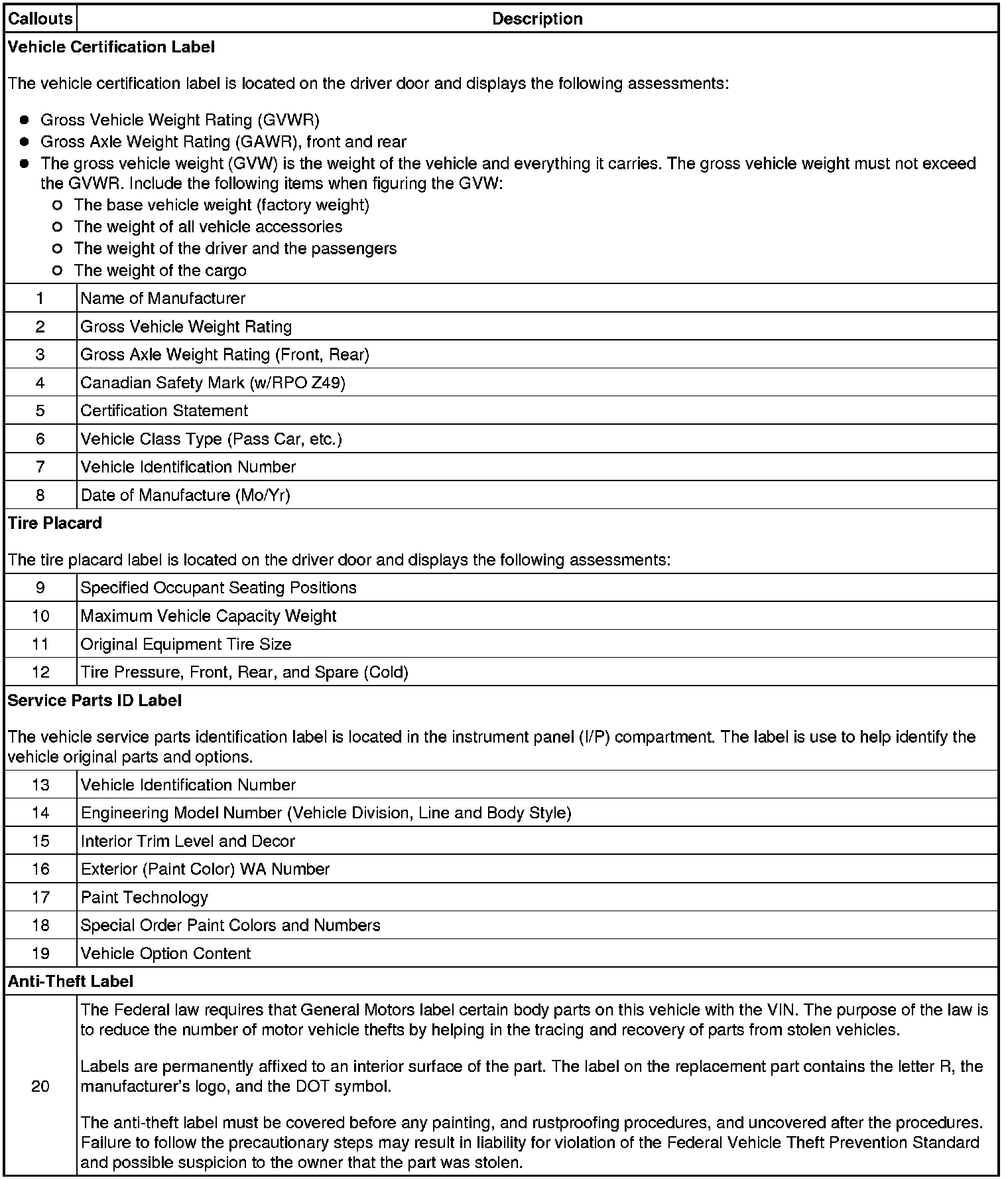 Vehicle Certification, Tire Placard, Anti-Theft, and Service Parts ID Label