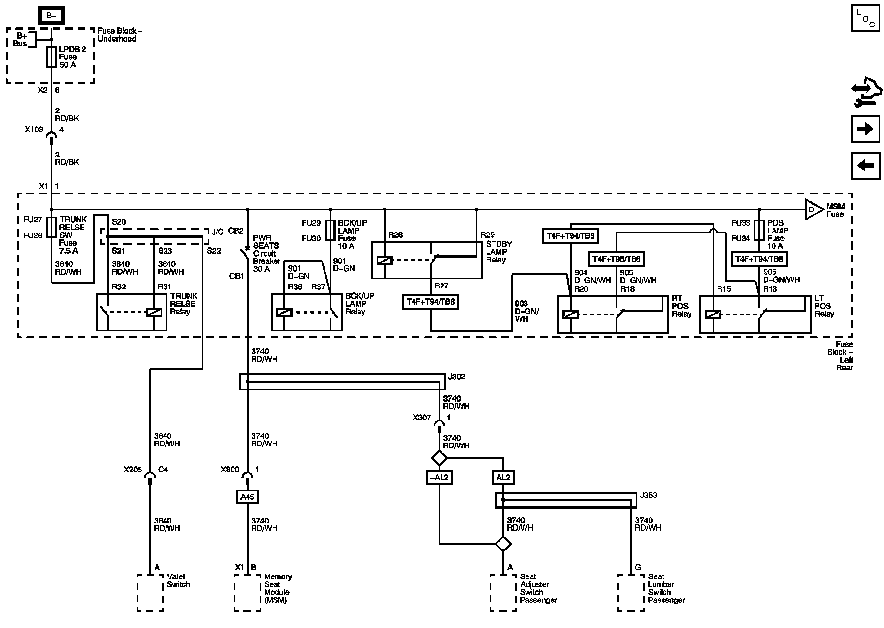 BCK/UP LAMP, POS LAMPS, and TRUNK RELSE SW Fuses, PWR SEATS Circuit Breaker
