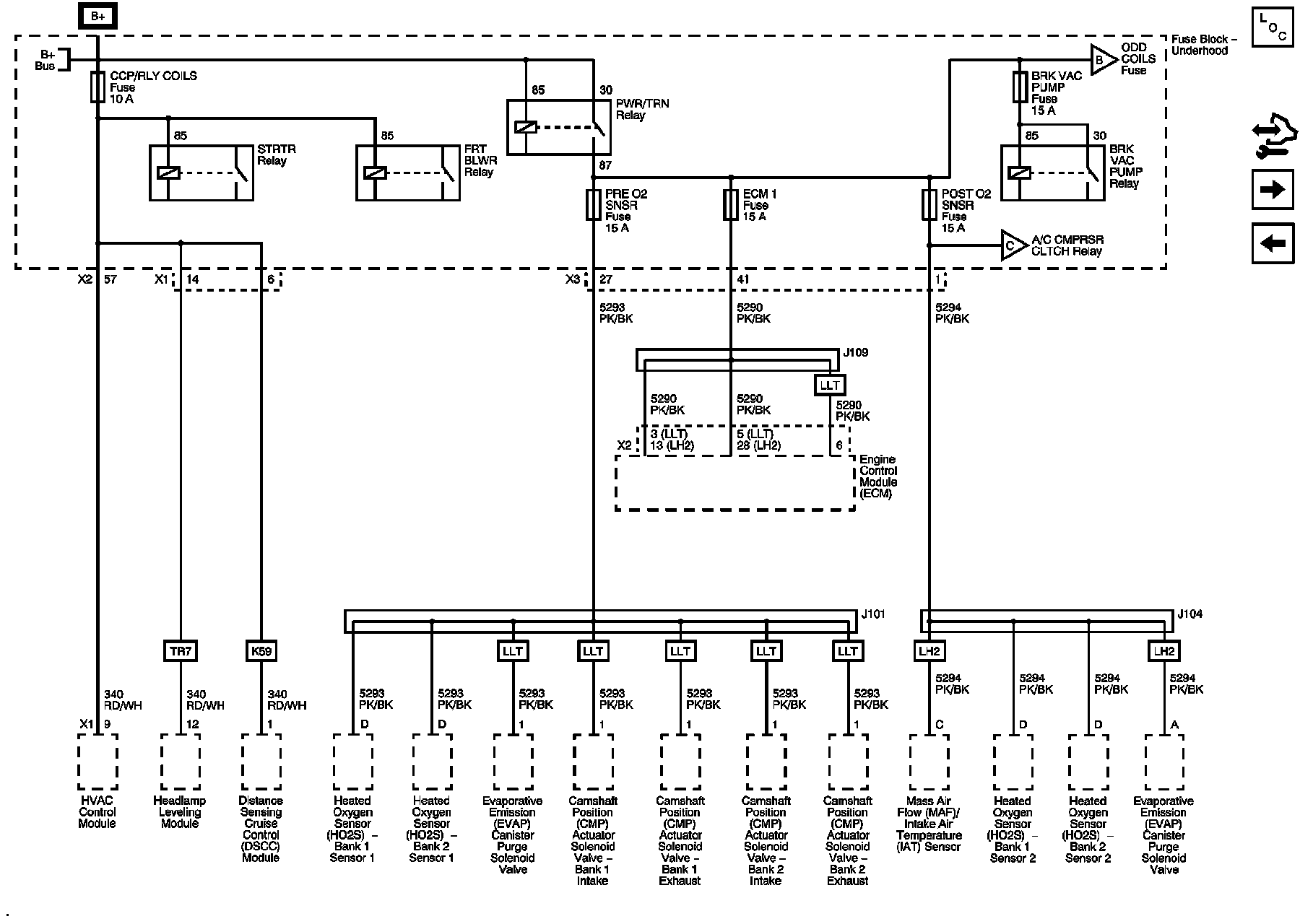 BRK VAC PUMP, CCP/RLY COILS, ECM 1, POST O2 SNSR, and PRE O2 SNSR Fuses