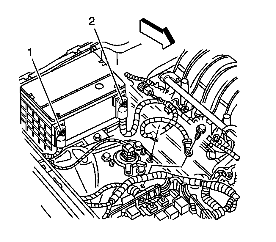 1. Disconnect the battery negative cable (2). Refer to Battery Negative Cable Disconnection and Connection (With Side Post) (Battery Negative Cable Disconnection and Connection (With Side Post))Battery Negative Cable Disconnection and Connection (With Top Post) (Battery Negative Cable Disconnection and Connection (With Top Post)).
