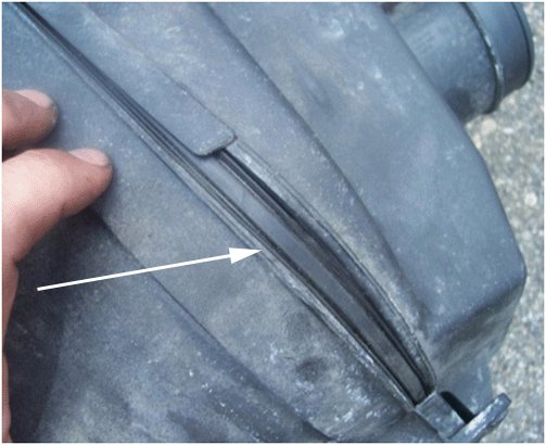 If a leak or leaks have been detected after the testing process, disassemble the air box by removing the cover. Inspect to make sure that the air filter gasket is making complete contact with the air box housing and cover leading sealing edges. The double lip seal should be seated (not folded) around the entire perimeter of the cover to the lower flange (top and bottom). If not, position the air filter seal to make complete contact around the housing edge, re-assemble the cover to housing with the cover screws tightened to 4 Nm (35 lb in) and re-test.