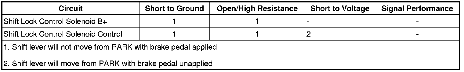 • If the test lamp does not illuminate , test the B+ circuit for a short to ground or open/high resistance. If the circuit tests normal, test or replace the shift lock control solenoid.