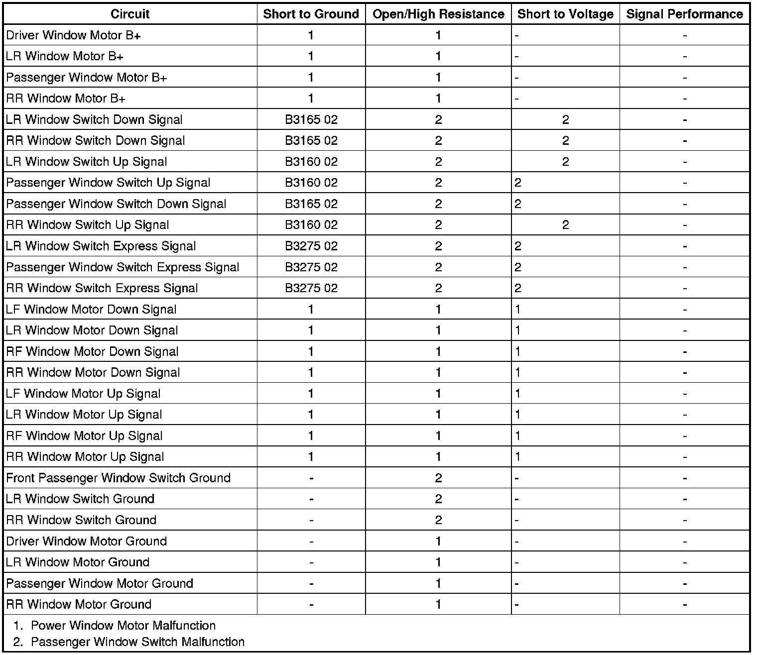 • If the front or rear passenger window is malfunctioning, refer to Passenger Power Window Malfunction.