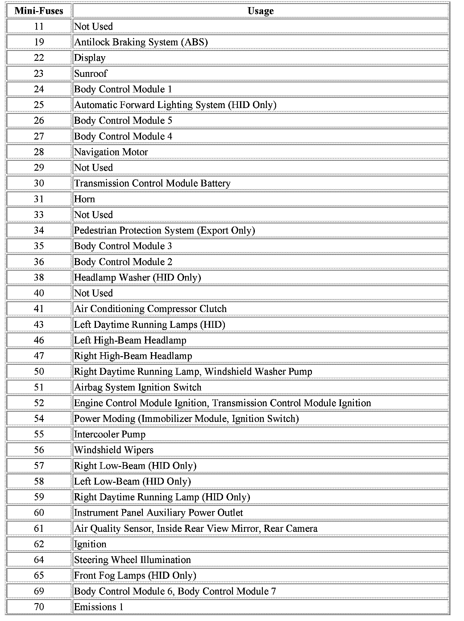 The vehicle may not be equipped with all of the fuses and relays shown.