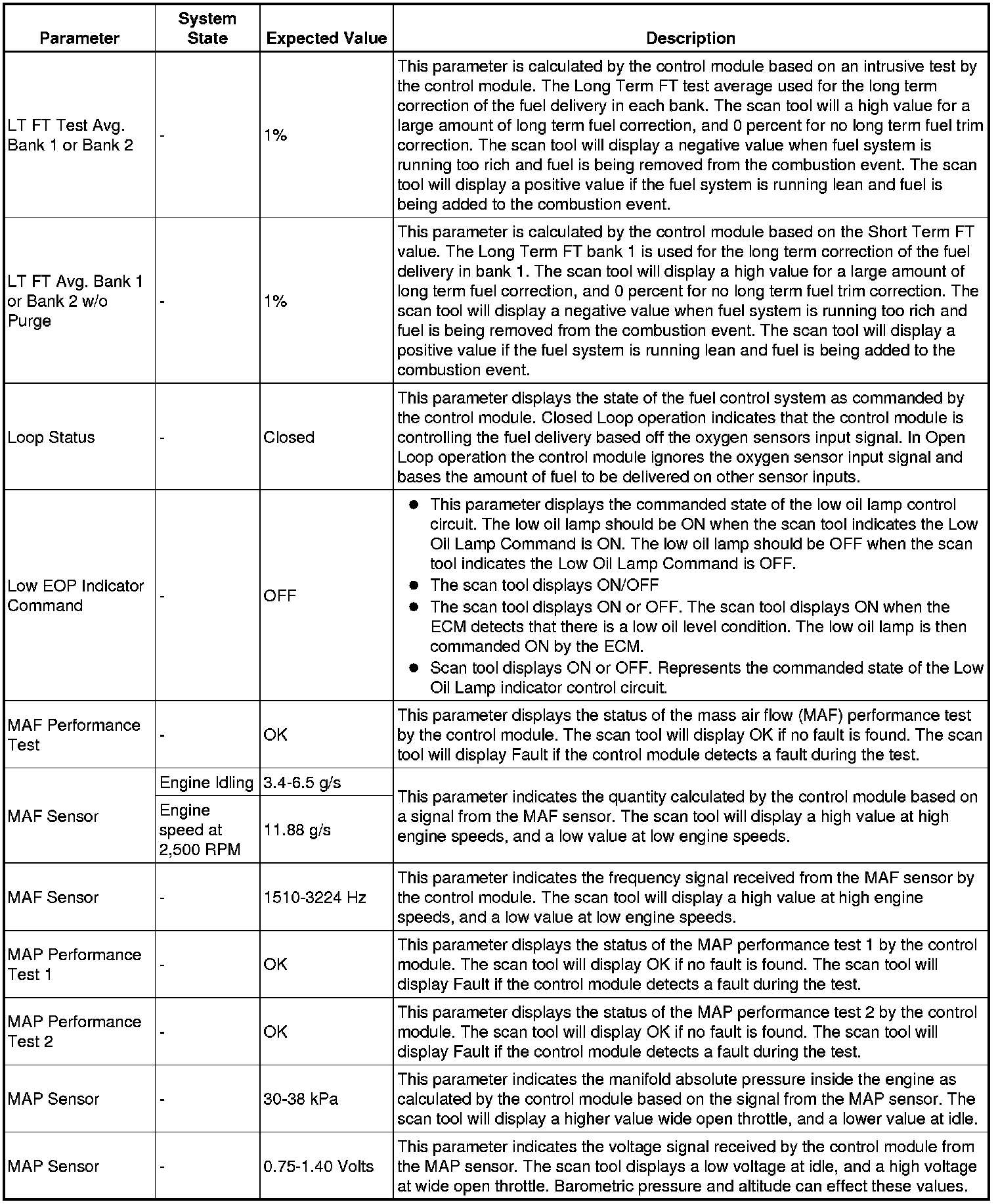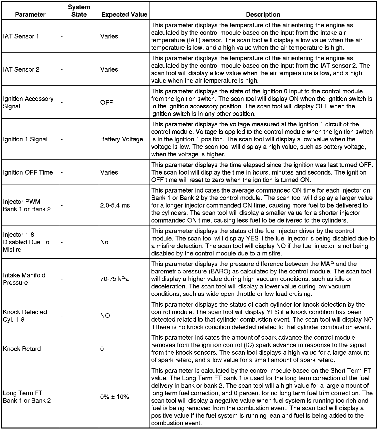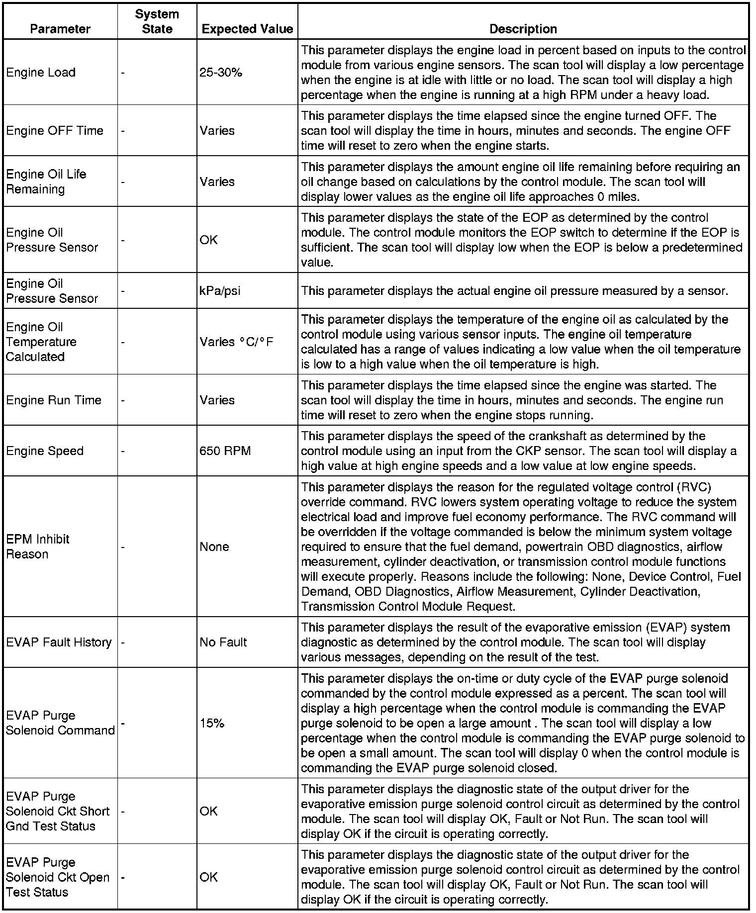 The scan tool values from a properly running engine may be used for comparison with the engine you are diagnosing. The engine scan tool data list represents values that would be seen on a normally running engine.