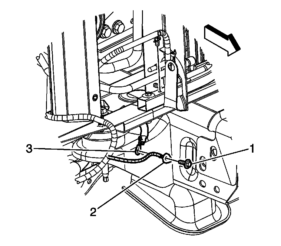 10. Remove the negative battery cable terminal (3) out through the opening between the radiator support and frame.
