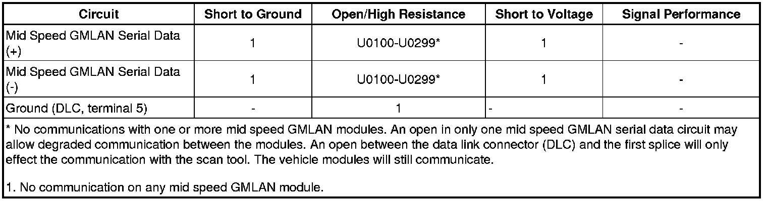 * Communication may be available between the BCM and the scan tool with the mid speed GMLAN serial data system inoperative. This condition is due to the BCM using the high, mid, and low speed GMLAN systems.