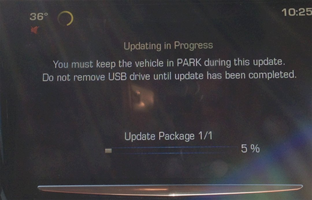 8. Once Update has been selected from the display, the screen in the picture above will appear. This screen will show the progress of the update. The navigation software update will take about 2 hours to load. The non-navigation software will take about 30 minutes to load.