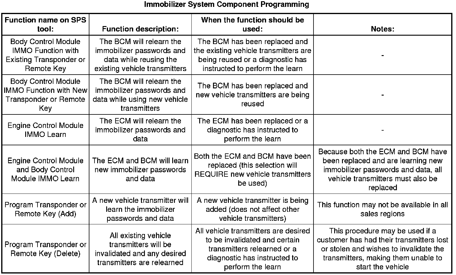 Depending on the immobilizer function being learned or the component replaced, different learn functions are required to be performed. These learn functions are as follows: