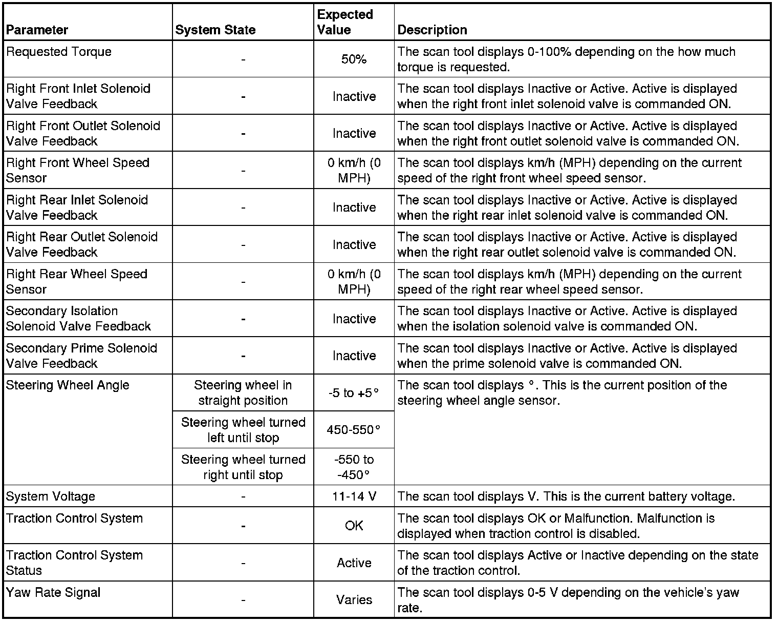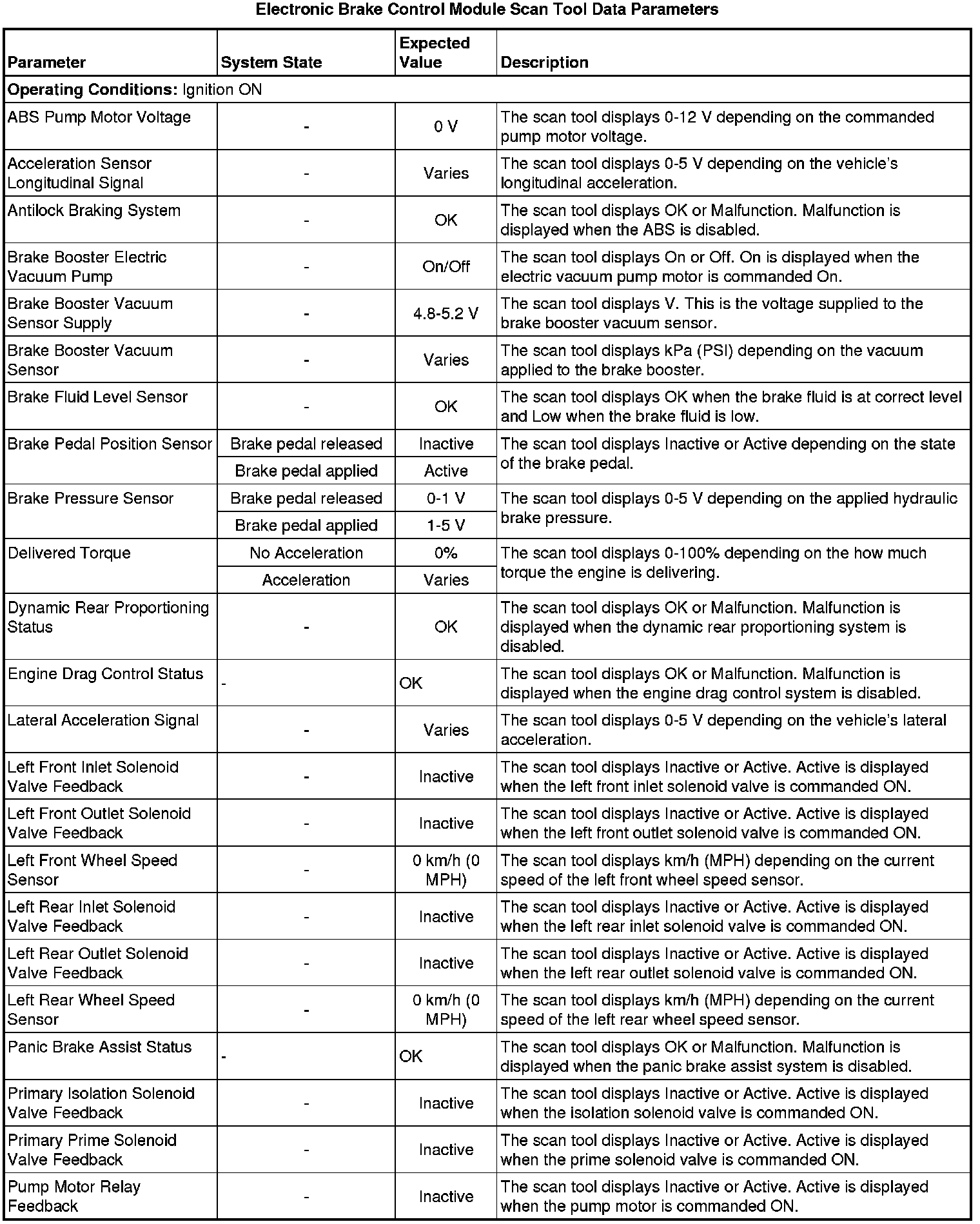 The Electronic Brake Control Module scan tool data parameters list contains all ABS related parameters that are available on the scan tool. The list is arranged in alphabetical order. A given parameter may appear in any one of the data lists.