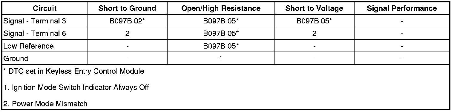 The Ignition Mode Switch contains two individual switches that provides redundant switch inputs to both the BCM and the Keyless Entry Control Module. The BCM supplies the Ignition Mode Switch a constant B+ signal. The BCM monitors this signal to determine if the switch is released or pressed. When the Ignition Mode Switch is not pressed, voltage on the signal circuit is pulled down through two resistors in the switch. When the Ignition Mode Switch is pressed, voltage on the signal circuit is pulled down through only one resistor, changing the voltage seen at the BCM and indicating that the Ignition Mode Switch is pressed.